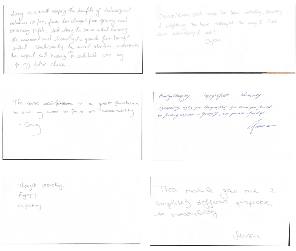 In the latter months of 2022, our Creative Director, Oscar worked hard to design over 16 hours of talk, activities and mediations that were given each week. Sessions were delivered with a heavy emphasis on feedback and co-creation. The philosophy behind the course was that our often limited view of sustainability can be opened up when enough space is given to this about these complicated issues. Oscar drew on his experiences studying bioprocess engineering in Copenhagen and anthropology in the Buddhist state of Bhutan in the himalayas to inject some ideas that are very much off the radar in our busy corporate lives into the sessions. The course ended with a 40-minute guided meditation and visioning exercise where graduates would build a personal manifesto in the form of 5 promises that were made between their present selves and future fantasies of self.